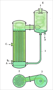 Self-circulating evaporator In a circulating evaporator, the liquid rises again into the overheating tube according to the principle of the siphon pump. In the separator connected thereto, the liquid is separated from the steam and flows back to the evaporator through the circulation pipe to form a closed circuit cycle. The greater the temperature difference between the heating chamber and the boiling chamber, the more steam bubbles are generated, which enhances the action of the siphon pump and increases the flow rate for good heat transfer. The standard evaporator is an old-fashioned circulating evaporator. A thicker circulation tube is installed at the center of the heating tube bundle, and the liquid level is higher than the upper tube sheet, so the amount of liquid is relatively high. ![]() Forced circulation evaporator Forced circulation evaporators are used to avoid fouling or crystallization of products boiling on the heating surface, for which reason the flow rate in the tubes must be high. The circulating liquid is heated as it flows through the heat exchanger and then partially vaporized as the pressure in the separator decreases, thereby cooling the liquid to a boiling temperature corresponding to the pressure. Due to the circulation pump, the operation of the evaporator is basically independent of the temperature difference, the recirculation rate of the material can be adjusted, and the evaporation rate is set within a certain range. In the crystallization application, the crystal can be adjusted by circulating flow rate and using special separation. The device design is separated from the circulating crystal slurry. The tubes can be arranged horizontally or vertically, depending on the conditions of the site and the requirements of the process, and in particular, when hot water is used instead of water vapor as the heating medium, a plate heat exchanger can be used. 1、Discharge pump 2、Discharge pump 3、Inlet 4、Splitter A、Heating steam inlet B、Concentrate outlet C、Condensate outlet D、Secondary steam outlet E、Heat exchanger ![]() Spiral tube evaporator Spiral tube evaporators are particularly suitable for achieving high concentrations and high viscosities. In order to achieve a high evaporation ratio, such evaporators operate at high temperature differences and in a single pass. In the spiral heating tube, the liquid to be evaporated flows from the top to the bottom, and at the same time, the boiling film flows in parallel with the steam. Since the heating tube is of course spiral shape, a long tube can be accommodated in a medium-high apparatus, after a long period of time. The steam generated in the flow of the pipe exerts a high shear force on the liquid film. For this reason, the curved spiral tube will cause a secondary flow, which is applied to the flow along the tube axis, which promotes turbulence and enhances heat transfer in the case of high viscosity. ![]() |